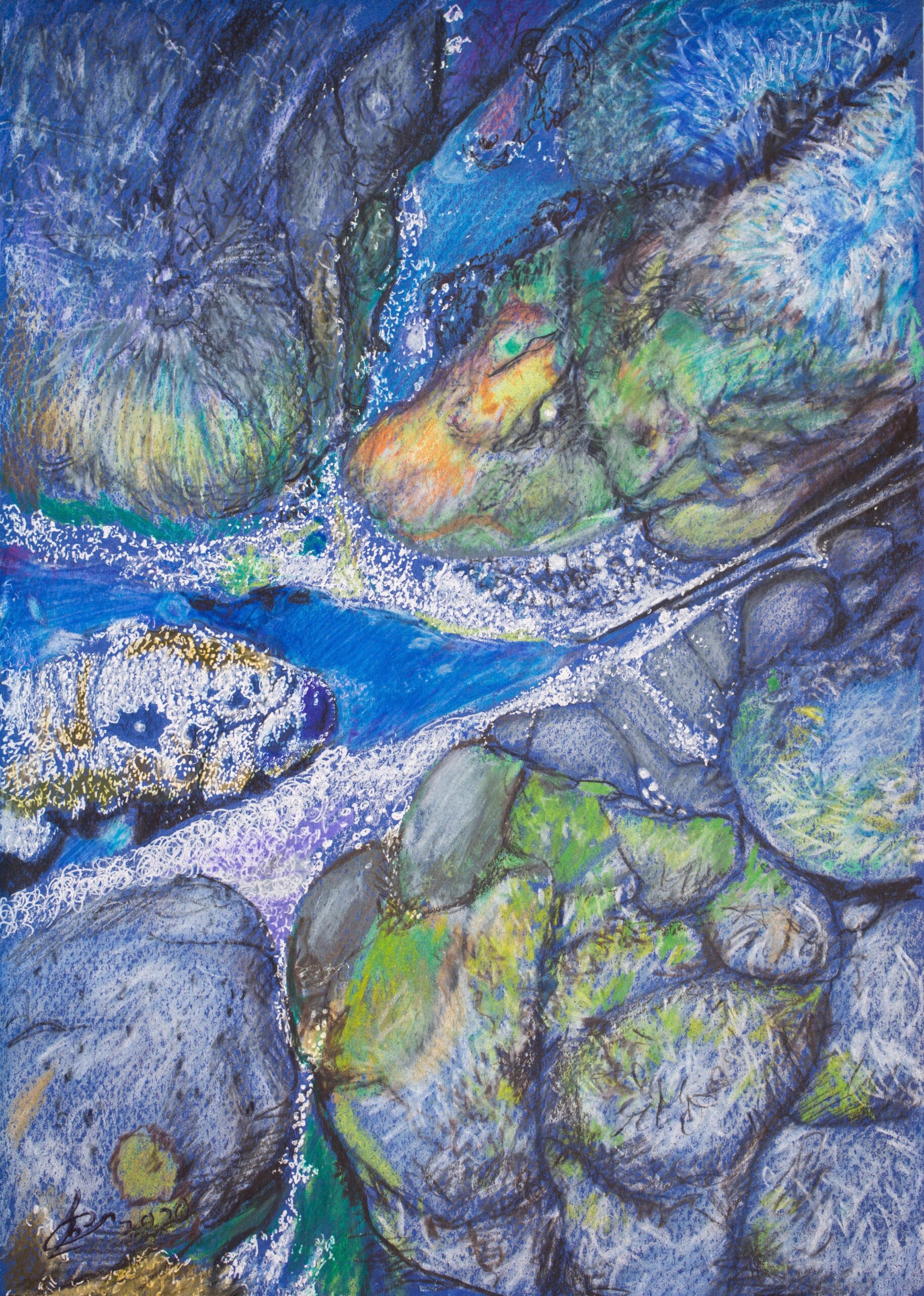 This painting depicts a young basalt field covered in green moss and snowmelt in Iceland. Colored Pencils on Canson Paper, West Coast, Iceland, 2022